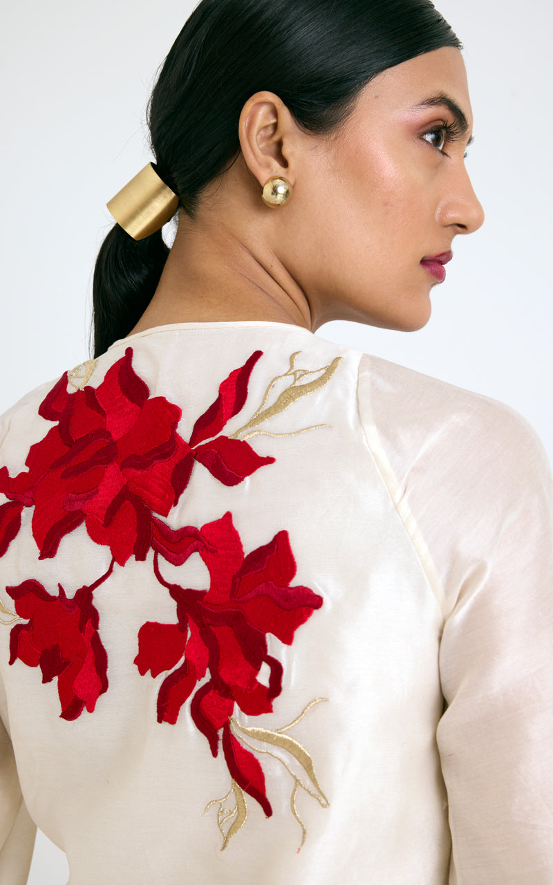 A dance of contrast and ease — the Malaca set pairs a fluid ivory top splashed with bold red florals against rich crimson wide-leg pants. The relaxed tie neckline and airy silhouette whisper sophistication, while the embroidery speaks confidence. Elegant, effortless, and made for modern celebrations.
