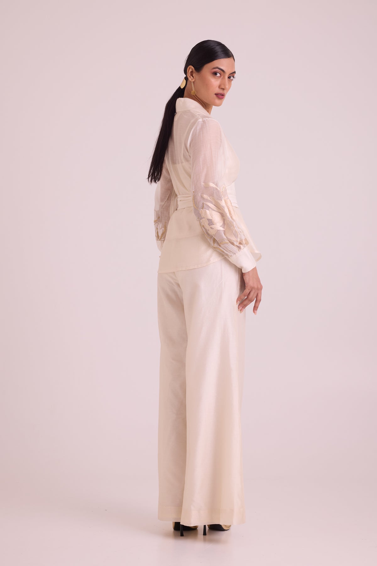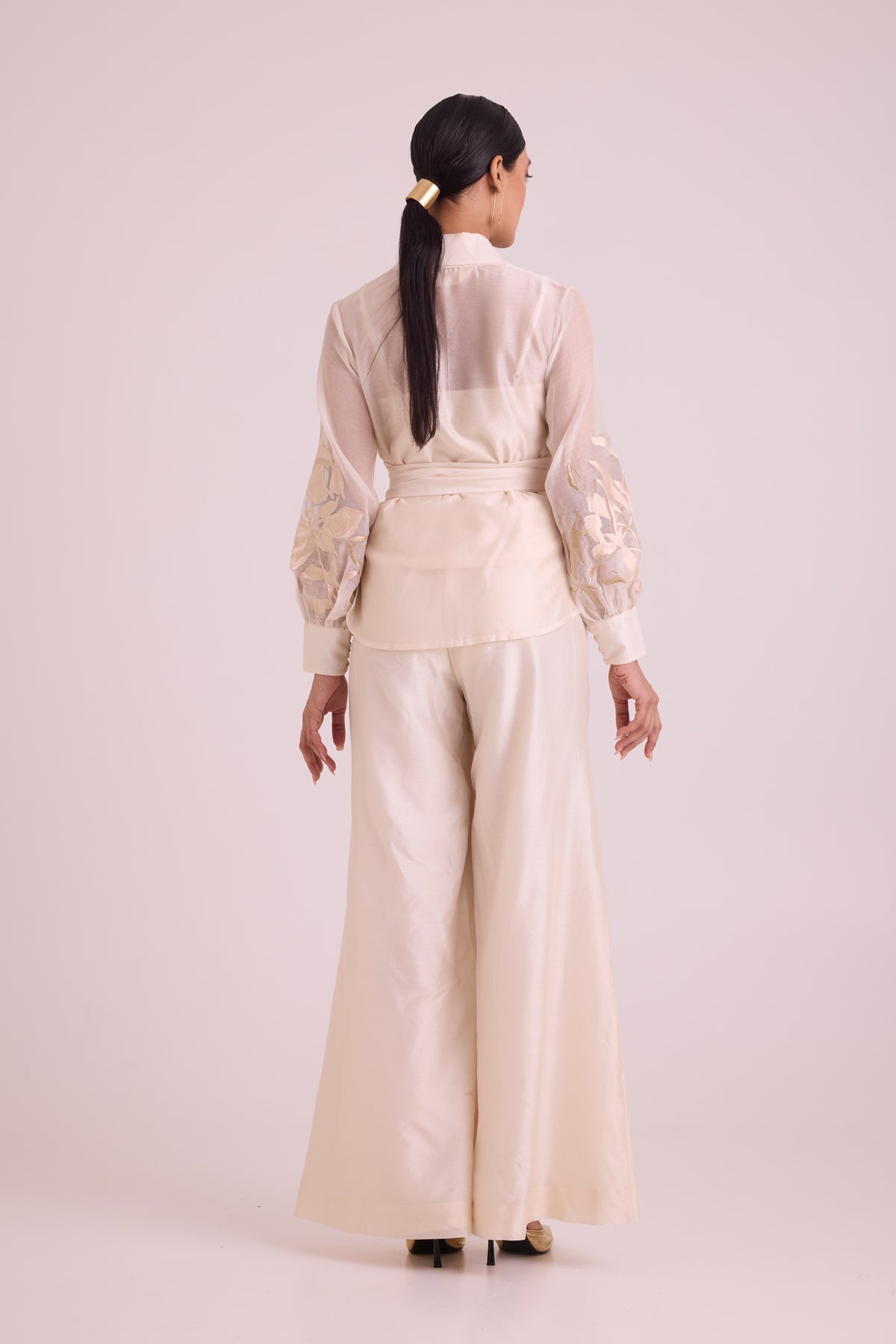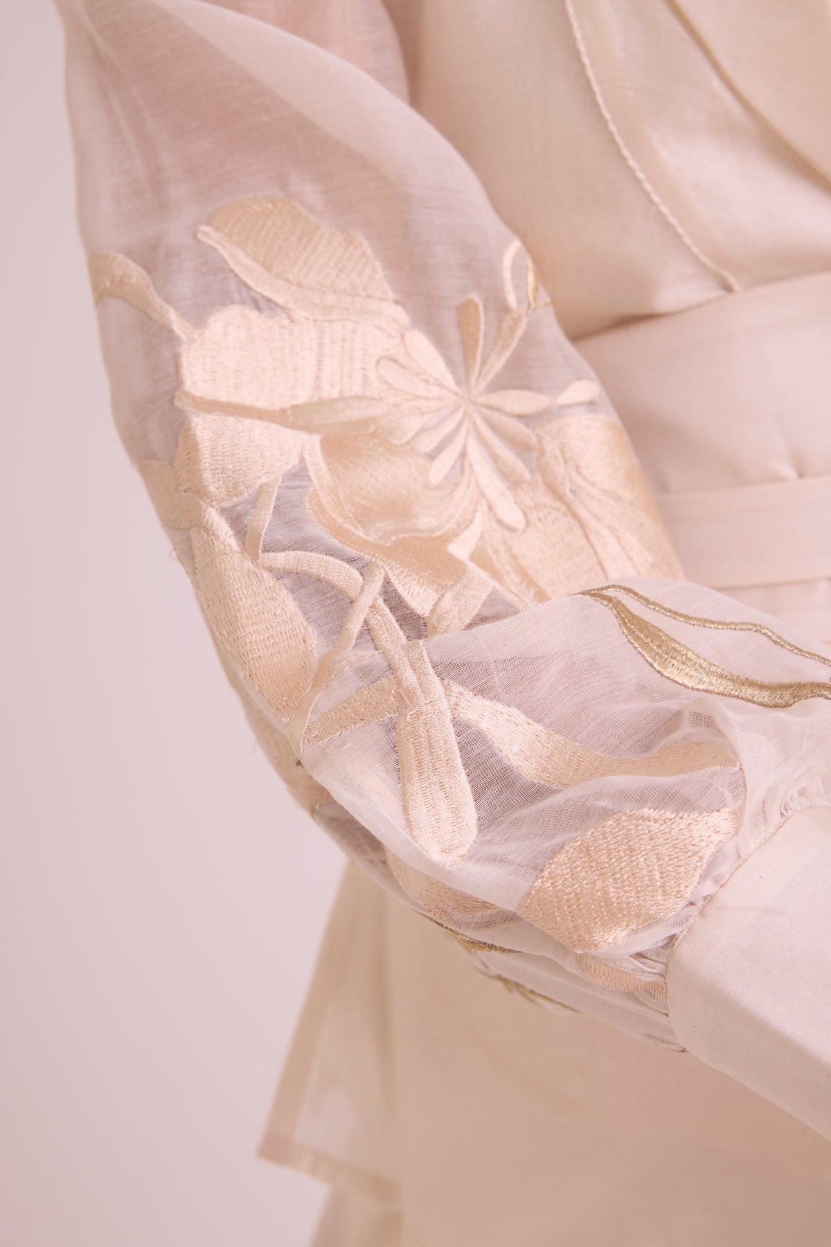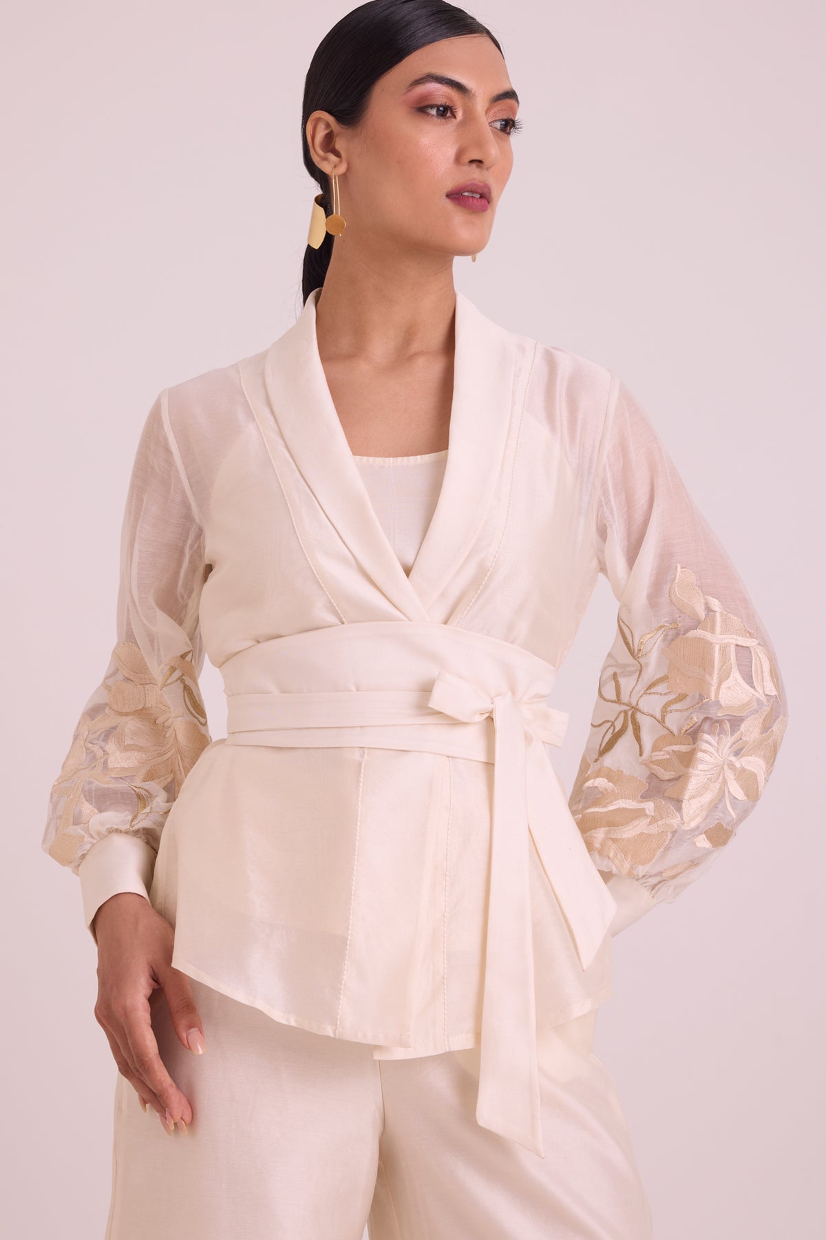 Murphy blends refined structure with quiet luxury in an ivory wrap top traced with delicate appliqué. The waist tie shapes a clean, feminine silhouette. Paired with the embroidered Duchess skirt, it creates an effortlessly polished occasion set.