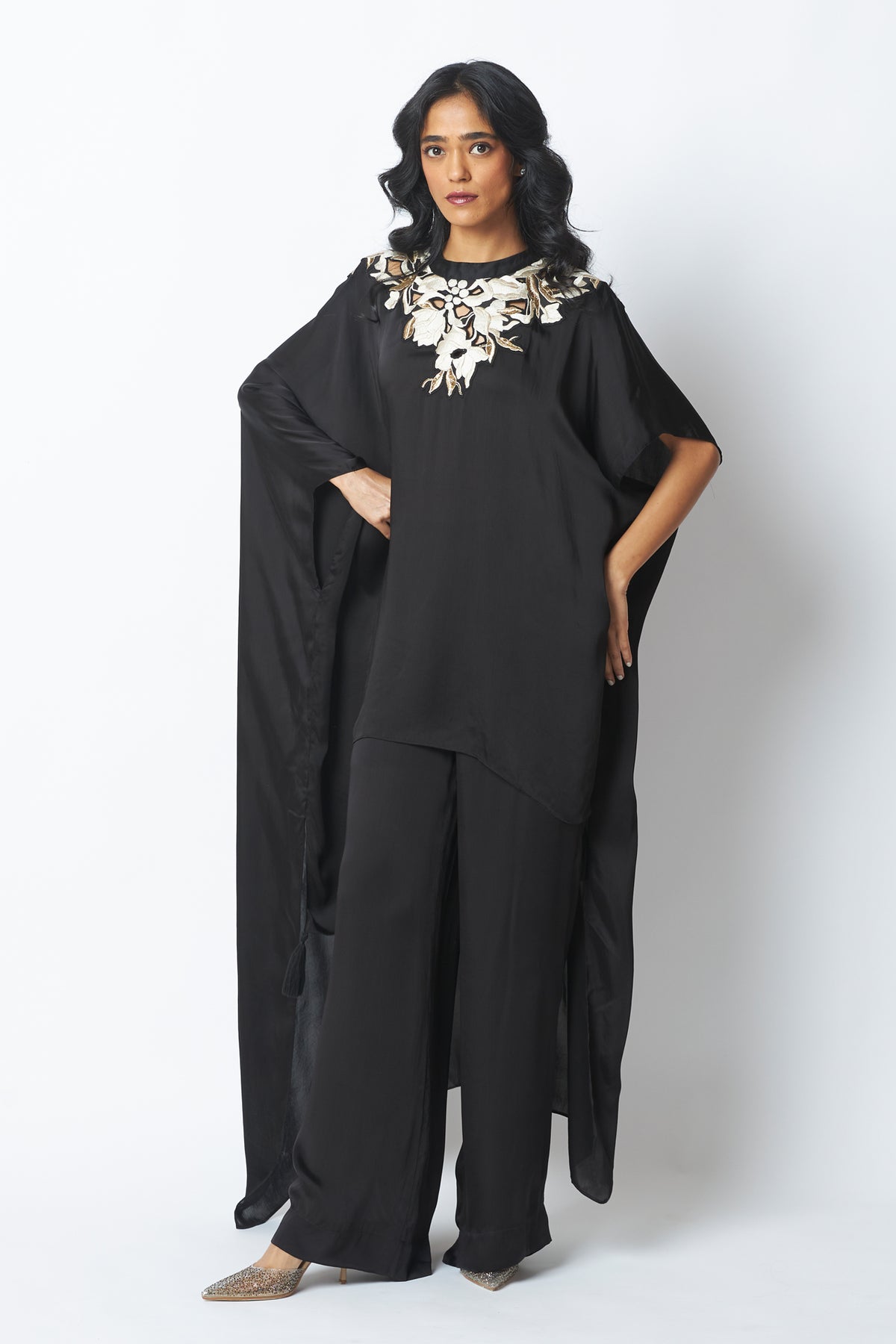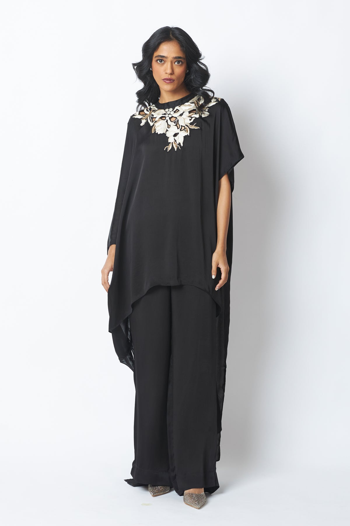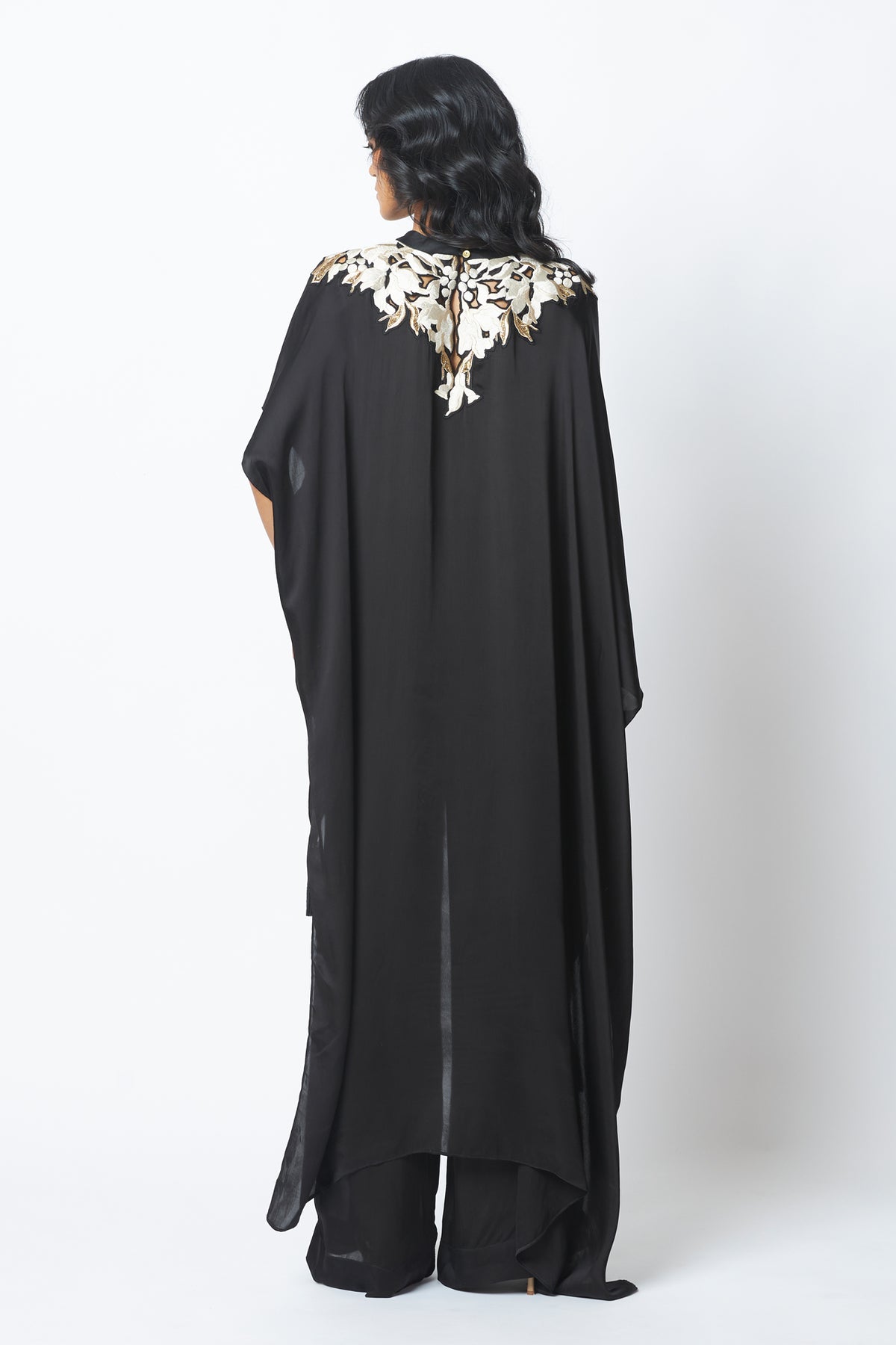 Anisa is timeless drama in fluid form, with a vintage-inspired kaftan silhouette. Delicate embroidery highlights the neckline, adding quiet opulence. Paired with relaxed pants, it’s effortless elegance that moves with you.