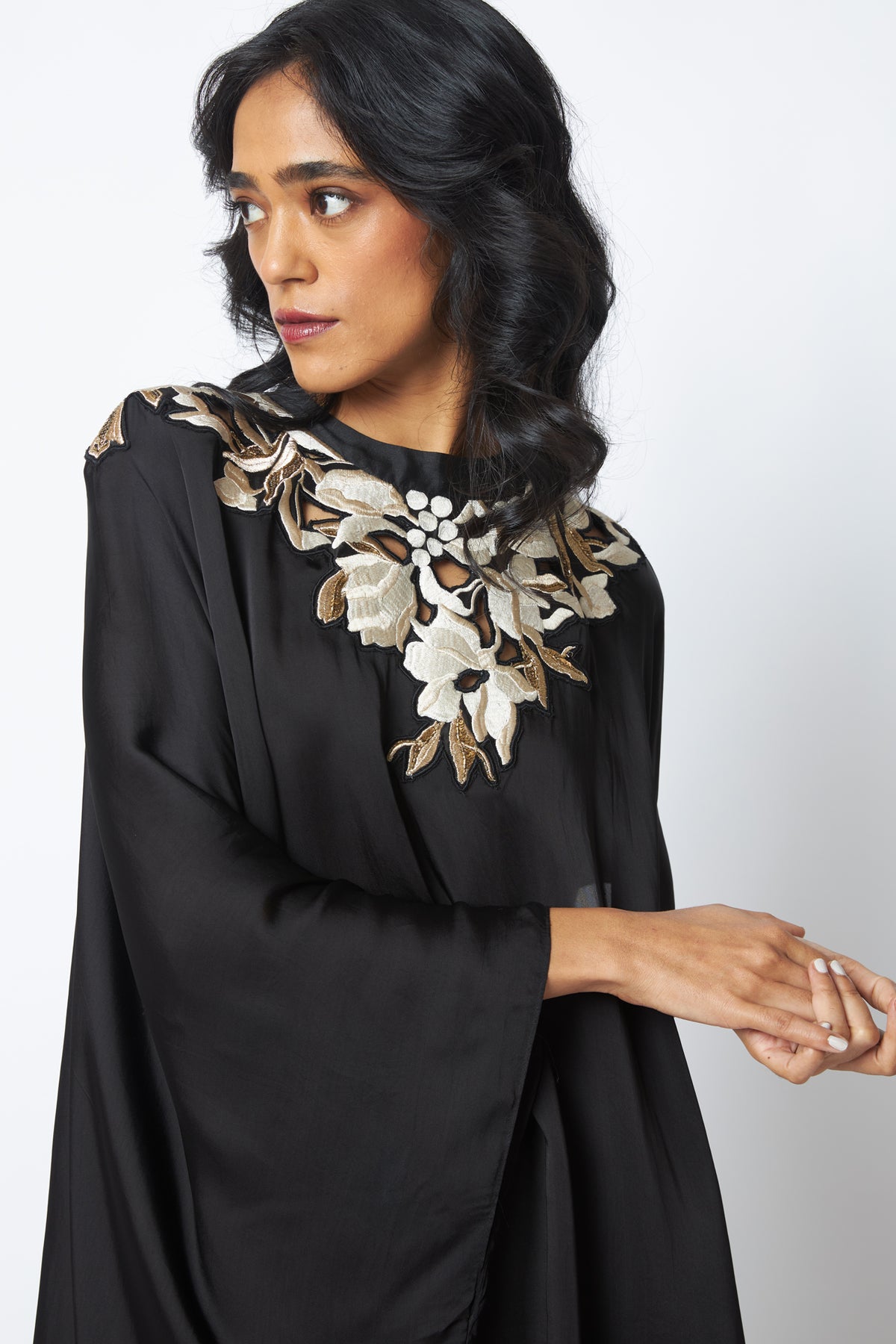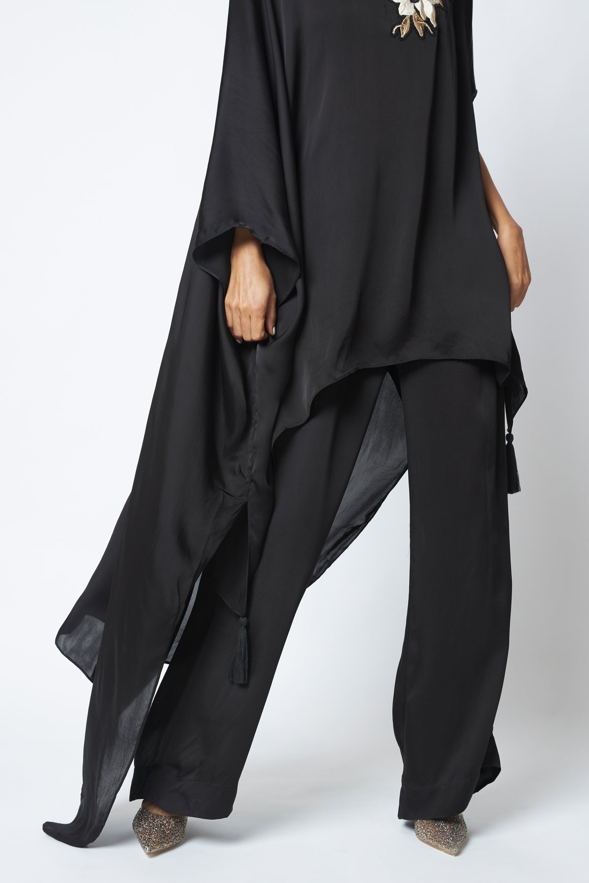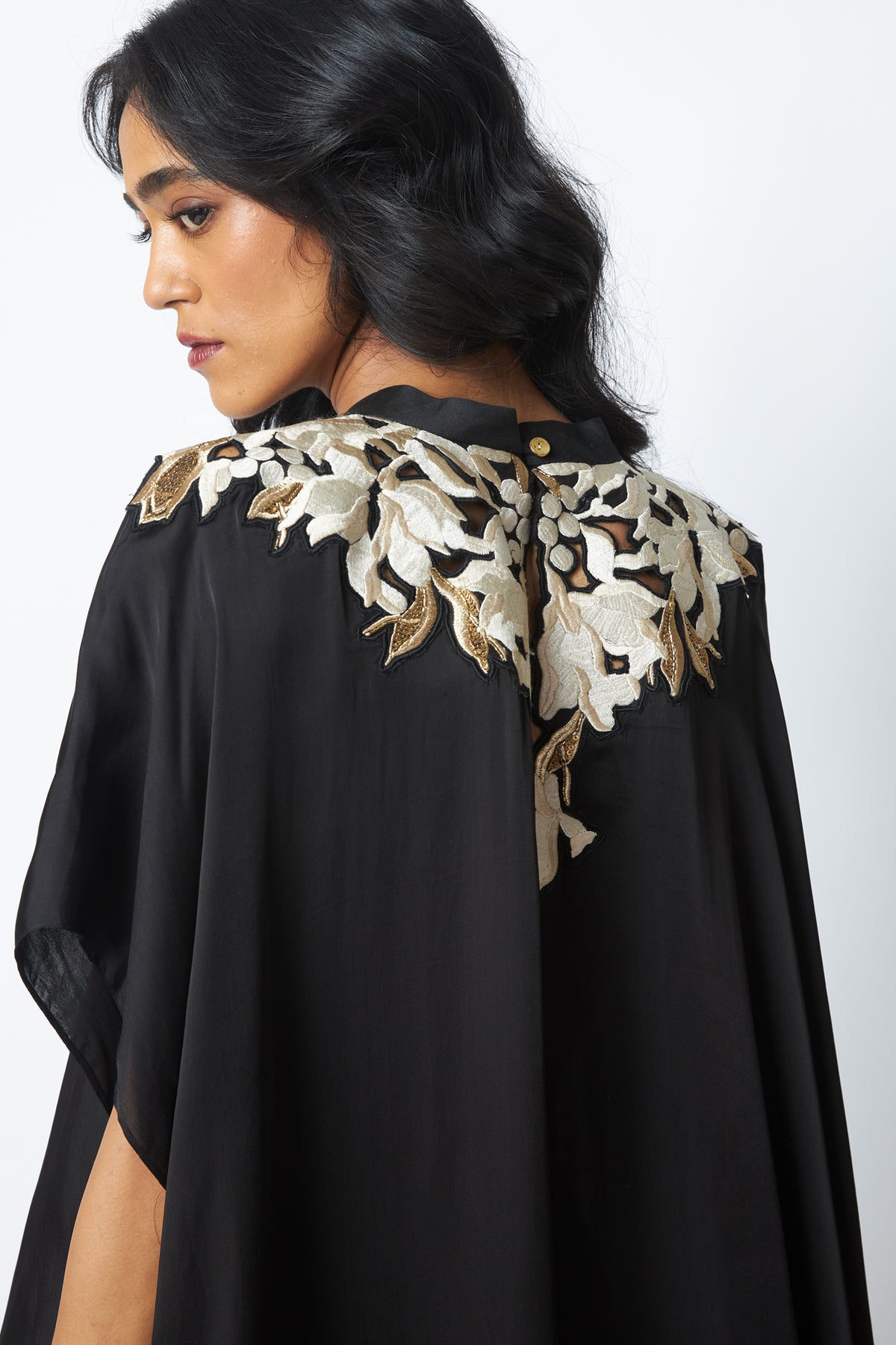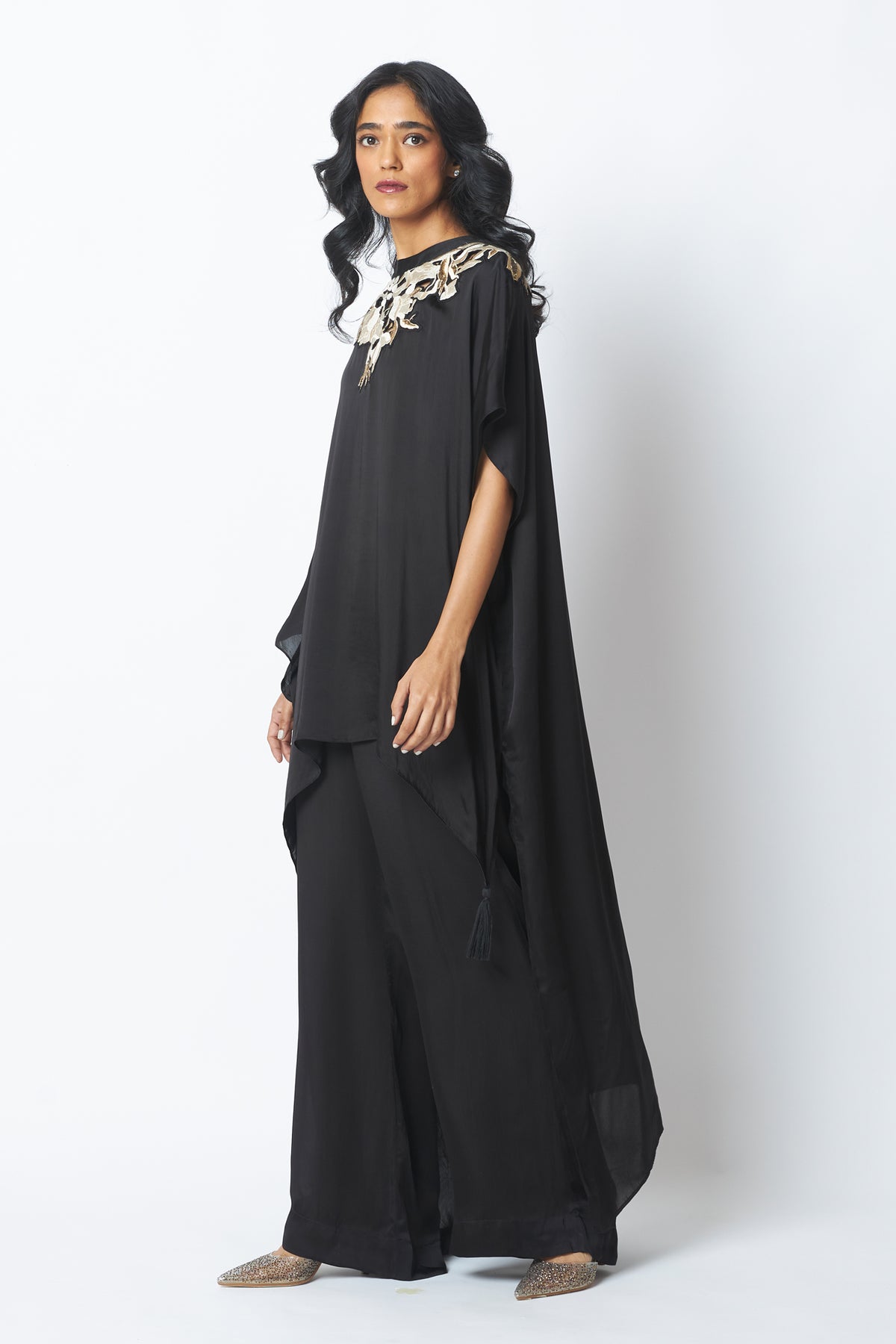 Anisa is timeless drama in fluid form, with a vintage-inspired kaftan silhouette. Delicate embroidery highlights the neckline, adding quiet opulence. Paired with relaxed pants, it’s effortless elegance that moves with you.